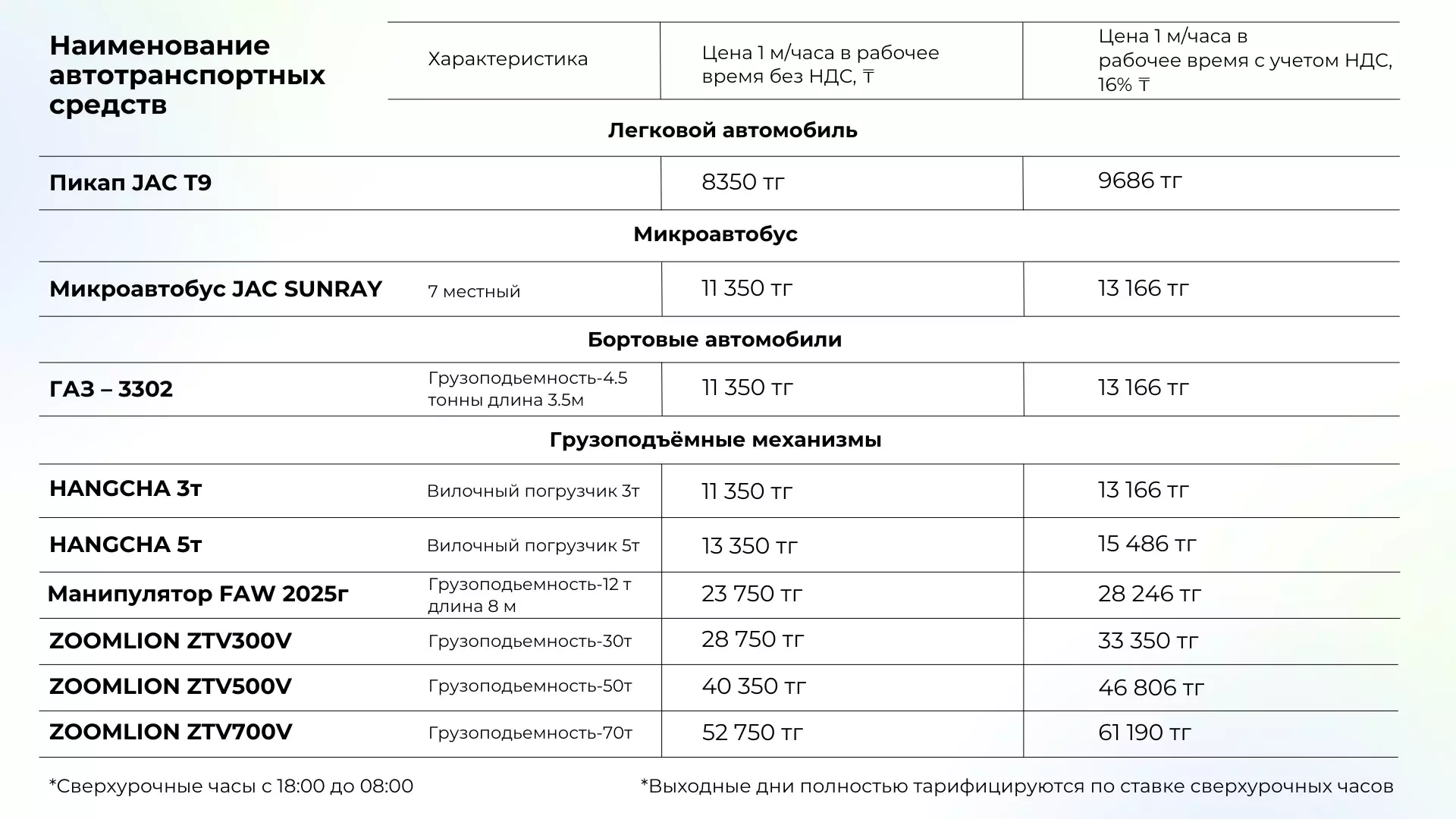 Стоимость аренды включает работу техники с опытным оператором и топливо. Дополнительные услуги обсуждаются индивидуально.